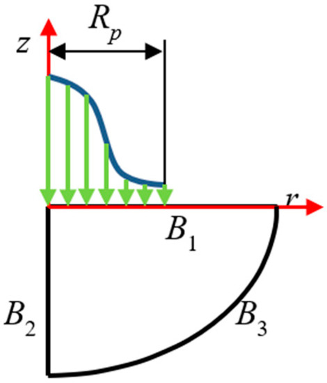 The boundary conditions and initial values of micro/nano-EDM are shown in Equation (10) [23]. B1 edge: when the r coordinate is smaller than or equal to the radius of the discharge channel (RP), the discharge energy q(r) will be absorbed by the workpiece. When the r coordinate is larger than the radius of the discharge channel (RP), the thermal energy is diffused outward by convection. hc is the convective heat transfer coefficient, ΔQ is the heat flux, and the Tref is the ambient temperature. B2 edge is an axisymmetric side. The heat flux on the B2 edge is 0. In the simulation model, the lengths of the B1 edge and B2 edge are 1000 times the length of the radius of the discharge channel (RP). Then, the B3 edge can be considered an open boundary. The heat flux on the B3 edge is 0. The initial temperature of the workpiece is the same as the ambient temperature.