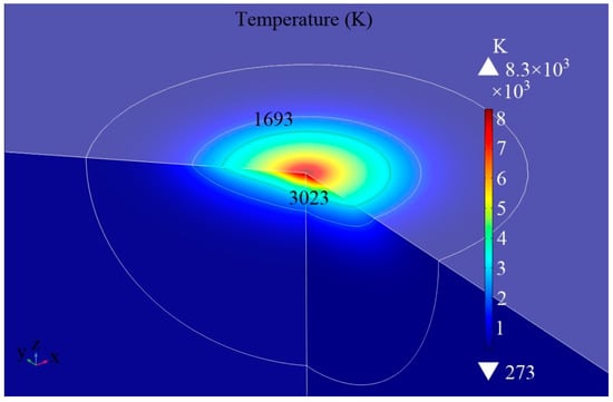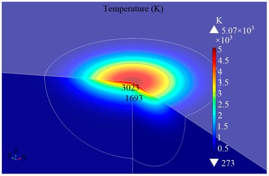 Based on the results and comparison, the influence of the non-Fourier effect on the temperature field distribution can be characterized and analyzed. Figure 2 and Figure 3 are the temperature field distribution results without considering and considering the non-Fourier effect in EDM, respectively. The processing parameters are as follows: pulse current of 1.15 A, pulse-on time of 0.49 μs, and peak voltage of 100 V. The calculated results show that the energy absorption ratio of the workpiece was 8.3%, and the radius of the discharge channel was 5.9 μm. From Figure 2 and Figure 3, the following can be observed: (1) The temperature distribution of the micro/nano-EDM was sequentially decreased from the center of the discharge point along the axial and radial directions; (2) the maximum temperature can reach thousands of degrees Celsius; according to the melting point/boiling point temperature lines in the figure, the volume of vaporized material of the workpiece reached about 40% of the volume of melted material, and therefore, it was necessary to consider the melting and vaporization latent heat simultaneously; (3) without considering the non-Fourier effect, the maximum temperature of the workpiece material was 5.07 × 103 K, the radius of the molten pool was 6.0 μm, and the depth of the molten pool was 2.03 μm; (4) considering the non-Fourier effect, the maximum temperature of the workpiece material was 8.3 × 103 K, the radius of the molten pool was 5.63 μm, and the depth of the molten pool was 1.87 μm; (5) from the aspect of the temperature gradient, the temperature gradient considering the non-Fourier effect was obviously higher than that without considering non-Fourier effect near the center of the discharge point. The main reason for this phenomenon is that the discharge process of micro/nano-EDM is transient. However, there was a time delay in the heat wave transfer. Thus, the discharge energy could not be transferred instantaneously to the workpiece material, which caused the discharge energy to gather in the center of the discharge point, promoting a larger temperature gradient near the discharge center.
