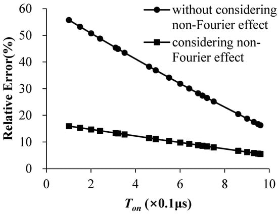 Figure 5 shows the relationship between the relative error of the thermal model and the pulse-on time. It can be found that: (1) In the thermal model without considering the non-Fourier effect, the simulation data of the crater radius and crater depth are larger than the experimental value. The relative error between the simulation data and experiment data of the volume of the discharge crater ranges from 16% to 55%. The average relative error is 33%. In the thermal model considering the non-Fourier effect, the simulation data of the crater radius and crater depth are slightly larger than the experimental value. The relative error between the simulation data and experiment data of the volume of the discharge crater ranges from 5% to 16%. The average relative error is 10%. It means that, in micro/nano-EDM, the thermal model considering the non-Fourier effect has higher prediction accuracy than that without considering the non-Fourier effect. (2) The relative error between the simulation data of the thermal model without and with considering the non-Fourier effect decreased with the increase in pulse-on time. A long pulse-on time ensures enough time for heat transferring within the workpiece material during the pulse-on time. The temperature field can better achieve a thermal equilibrium state. The thermal hysteresis has little effect on heat conduction. The non-Fourier effect is not significant under long pulse-on time (>1 μs). Meanwhile, the thermal relaxation time of metal is of the order of magnitude of 10−9–10−8 s. The duration time of discharge pulse is of the order of magnitude of 10−7–10−6 s. Then, the effect of thermal hysteresis on the thermal transmission during the material removing process is more significant under the shorter pulse-on time, especially when the duration time of discharge pulse is as low as 0.1 μs. The distribution of thermal energy is more concentrated under the shorter pulse-on time. Then, the proportion of the workpiece material is removed because vaporizing increases with the decrease in pulse-on time under the same discharge energy in the single-pulse discharge process. It means the non-Fourier effect is more obvious under the shorter discharge time of a single pulse.