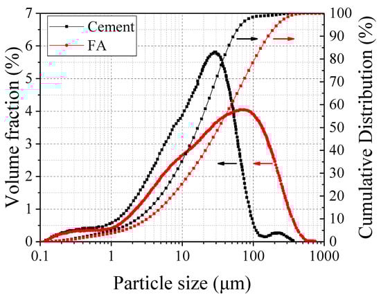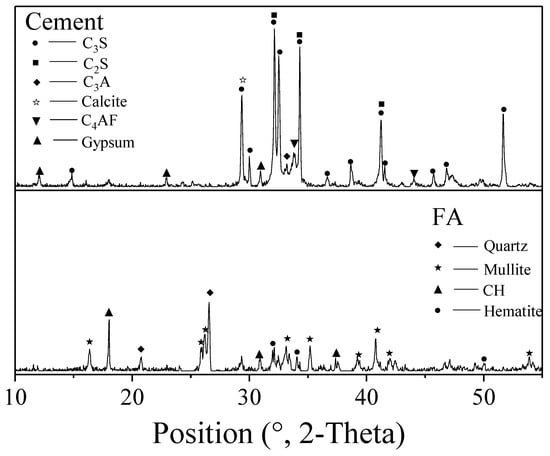 The cement used in the experiment was P·I 42.5, in accordance with Chinese GB 175-2007 with a specific surface area of 355 m2/kg. The specific surface area of FA was 434 m2/kg (BET method). Table 1 shows the main chemical compositions of the cement and FA. The X-ray diffraction patterns of the powders are shown in Figure 1. It can be found from Figure 1 that the main phases in cement include C3S, C2S, C3A, Calcite, etc., and the main phases in FA are Quartz, CH, Mullite, etc. The particle size distribution of the cement and the FA are shown in Figure 2. The measured D50 of the cement and the FA were about 16.6 μm and 32.9 μm, respectively.