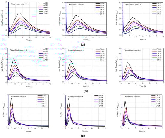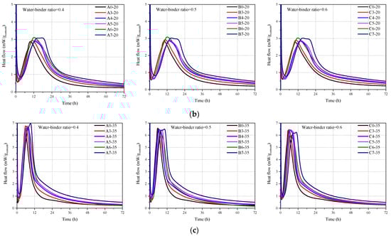 Heat flow of cement pastes at different temperatures. (a) heat flow of the cement paste at 10 °C; (b) heat flow of the cement paste at 20 °C; (c) heat flow of the cement paste at 35 °C.