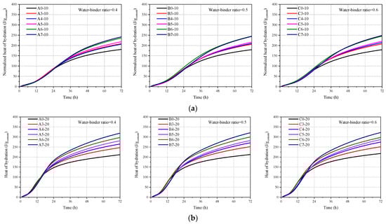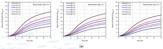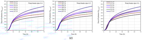 Cumulative heat release of cement pastes at different temperatures. (a) cumulative heat release of the cement paste at 10 °C; (b) cumulative heat release of cement paste at 20 °C; (c) cumulative heat release of cement paste at 35 °C.