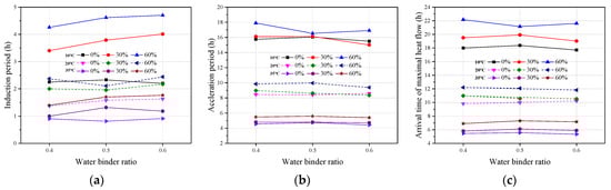 The hydration theory based on topochemical reaction, rather than through-solution mechanism, seems to be able to explain this process [,]. After the hydration of C3S and other components in cement particles, a semi-permeable gel layer is formed. When the water molecules diffuse into the gel layer, the gel layer ruptures and the hydration begins to accelerate as a result of the stress and chemical gradient []. Due to the reduction in cement weight, the hydration stress and chemical gradient are small. For cement paste with large volume FA, the start of the acceleration period is delayed. When FA replaces cement in a large volume, FA can play a diluting effect and increase the effective water-binder ratio. Therefore, the hydration degree of cement is increased, and the exothermic peak generated is also increased (Figure 6). Considering the FA cannot serve as nucleation sites for C–S–H gels, the hydration rate of cement does not increase, and the slope of the heat flow curve marginally changes during the acceleration period. Due to the delay in the start of the acceleration period, the arrival time of the exothermic peak is also delayed.