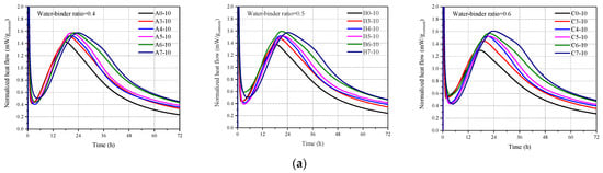 Heat flow of the paste at different temperatures (normalized to cement). (a) heat flow of the paste at 10 °C; (b) heat flow of the paste at 20 °C; (c) heat flow of the paste at 35 °C.