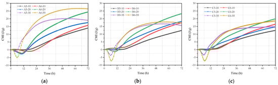 CMI values of FA at different water-binder ratios. (a) CMI values of FA at water-binder ratio of 0.4; (b) CMI values of FA at water-binder ratio of 0.5; (c) CMI values of FA at water-binder ratio of 0.6.