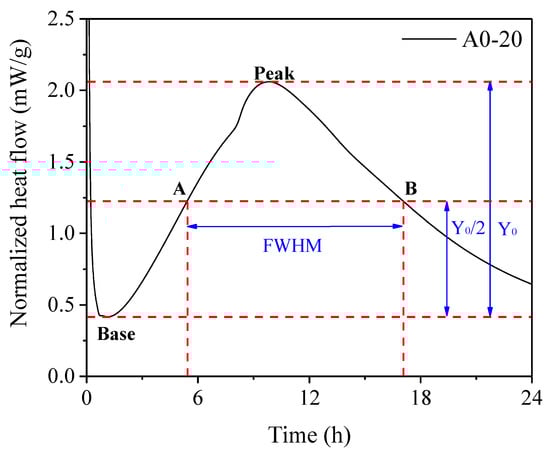 Wu et al. [] used full width at half maximum (FWHM) value for the analysis of isothermal calorimetry results of blended cement pastes. As shown in Figure 9, the heat flow curve of A0 at 20 °C was taken as an example. According to the method proposed by Wu et al. [,], by subtracting the maximum heat flow value and the minimum heat flow value, the Y0 value is obtained. The width of the heat flow curve at half Y0 is the FWHM value. Generally, the heat flow curve obtained by isothermal calorimetry can only qualitatively describe the influence of different admixtures on the hydration process. The FWHM value can comprehensively and quantitatively analyze the hydration process of cement-based materials.