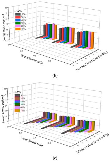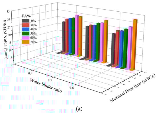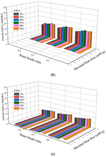 According to the results of the Figure 10 and Figure 11, it can be found that the peak heat flow of the FA-cement paste decreased with the increase of FA content and water-binder ratio, but the increase of temperature could increase the peak heat flow. Differently to the FA-cement paste, it can be seen in the heat flow curve that temperature, FA content and water-binder ratio were proportional to the peak heat flow of cement. The increase of temperature, FA content and water-binder ratio all led to an increase in the peak heat flow. Analysis of the relationship between the FWHM values and the peak heat flow under the two normalization methods showed completely different results. Although the FWHM values were constant at different temperatures, with the change of FA content and water-binder ratio, the change of FWHM values was consistent with the change of heat flow peak normalized to cement. In contrast, the peak value of heat flow from normalization to paste showed the completely opposite trend.