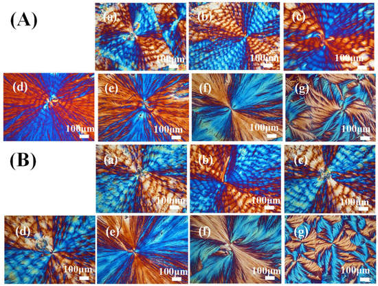 POM graphs of (A) (R)-MA/PVPh and (B) (S)-MA/PVPh blends crystallized at Tc = 60 °C for different compositions: (a) 90/10, (b) 85/15, (c) 80/20, (d) 75/25, (e) 70/30, (f) 60/40, and (g) 50/50.