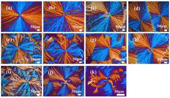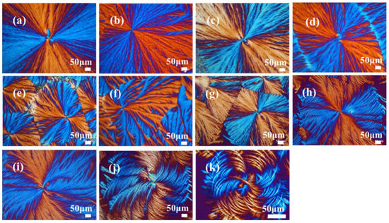 POM graphs of (S)-MA/PVPh (50/50) blend at different Tc: (a) 30, (b) 35, (c) 36, (d) 40, (e) 45, (f) 48, (g) 50, (h) 55, (i) 60, (j) 63, and (k) 65 °C.
