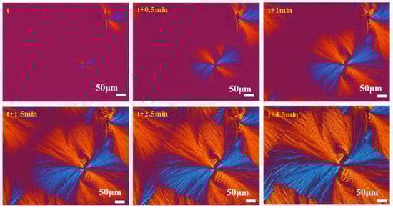 It has been established that (R)-MA contains a chiral optical center (R-form), and the molecules of (R)-MA in crystal lattices are right-handed [32]. Lamellar bending occurs in the counterclockwise direction in the (R)-MA/PVPh (50/50) blend at Tc = 45 °C, indicating that the lamellae grow oppositely with the optical chiral center of MA. Nonetheless, the clockwise lamellar bending in the (R)-MA/PVPh (50/50) blend at Tc = 65 °C indicates that the lamellae grow in line with the optical chiral center of MA at higher crystallization temperatures. It is quite fascinating that the bending direction of MA spherulites in the (R)-MA/PVPh (50/50) blend corresponds to their chirality, which is right-handed or clockwise at higher temperatures but reversible at lower temperatures. Furthermore, the crystallization of the (S)-MA/PVPh (50/50) blend is observed to determine whether chirality and temperature both could dictate the bending direction. Effect of chirality on the bending sense of lamellae in crystal self-assembly was also observed in other organic compounds. As previously reported by Oaki et al. [16], chiral aspartic acid had the same structure but faced opposite directions: D-Asp was left-handed, while L-Asp was right-handed. Thus, if chirality affects the bending sense of dendritic spherulites in the (R)-MA/PVPh blend, the spherulites in the (S)-MA/PVPh blend should bend in the opposite direction as that in the (R)-MA/PVPh blend. It is worth noting that the bending is related to the chirality of MA only at higher temperatures (60–65 °C), not at intermediate temperatures (36–48 °C). This indicates that other factors, in addition to molecular chirality, might cause lamellae to bend in (R)-MA/PVPh vs. (S)-MA/PVPh. These factors are almost certainly related to crystallization temperature.