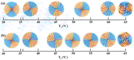 Schematics for the birefringent patterns of (a) (R)-MA/PVPh (50/50) and (b) (S)-MA/PVPh (50/50) blend at different crystallization temperatures.