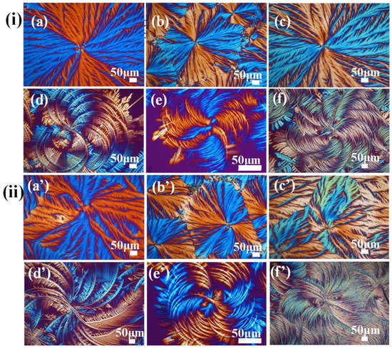 POM graphs of (i) (R)-MA/PVPh (50/50) and (ii) (S)-MA/PVPh (50/50) blends crystallized at (a–c, a′–c′) Tc = 45 °C and (d–f, d′–f′) Tc = 65 °C. The film thickness is (a,d) 2–5; (b,e) 10–20; and (c,f) 25–30 µm.