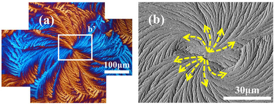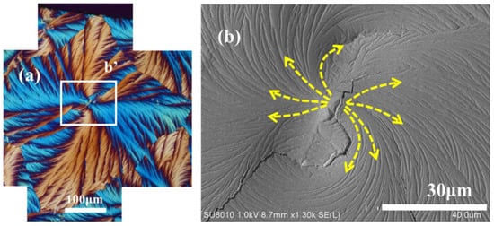 A comparison of POM and SEM micrographs of crystallized (R)-MA/PVPh (50/50) blend crystallized at Tc = 65 °C is demonstrated in Figure 9a depicting the entire spherulite, while Figure 9b depicts the spherulites’ center. As illustrated in Figure 9b, dendrites originate from the nucleus region, where a single strand of initially straight nuclei resembling fibers splays out spontaneously into four or more arms, all growing in clockwise-bending sense in the dendritic spherulites. Divergence is observed in the dendritic spherulites at various crystallization temperatures. At an intermediate temperature (Tc = 45 °C), numerous main stalks explode outward from the nucleus center. In contrast, at higher temperature (Tc = 65 °C), fewer main stalks grow from the nucleus center, and entire spherulites are less compact than at intermediate temperatures. This difference is due to the depression of the (R)-MA spherulite growth rate at higher temperatures.