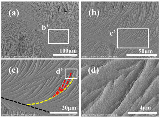 (a) SEM micrographs: (b–d) enlarged zoomed-in images of the squared regions—c′ and d′ of (S)-MA/PVPh (50/50) dendritic spherulite crystallized at Tc = 45 °C.