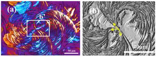 (a) POM, b′ indicating the white-squared region to be zoomed-in by SEM and (b) SEM micrograph of (R)-MA/PVPh (50/50) blend crystallized at 45 °C.
