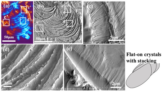 An intriguing feature is observed in the different birefringence bands if one zooms into one single sector of the (R)-MA spherulite. The POM and SEM images in Figure 10a,b demonstrate a correlation between a single branch’s three distinct types of birefringence of lamellar spots. As illustrated in Figure 10c–e, orange and blue birefringence corresponds to the periodic bending in flat-on lamellae (see scheme in lower-right). The flat-on lamellae of dendritic spherulites are organized by single crystals for orange and blue birefringence. Crystal orientation differences do not cause the alternate optical orange or blue birefringence observed in POM micrographs; instead, the periodic branching to different bending directions is responsible for the alternate optical bands.