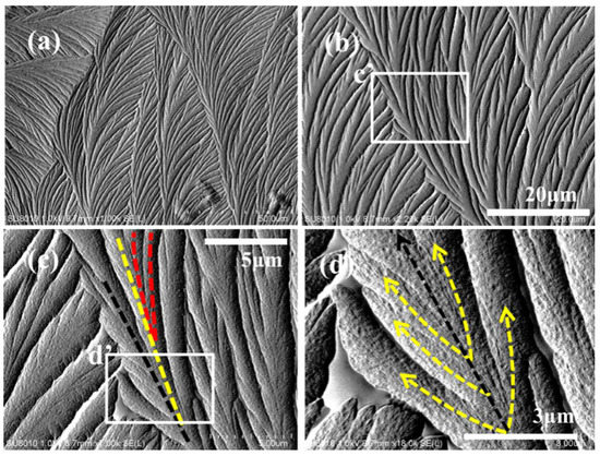 Figure 8a shows each of the main stalks of (R)-MA exploded into closely packed side branches that grow in the counterclockwise bending rhythm. As illustrated in Figure 8a, numerous primary stalks extend from nuclei crystals and bend in unison from the start to emerge into another primary stalk. They all bend counterclockwise in unison up to the terminating peripherals. Figure 8b–d depicts the entire branch, the primary and secondary branches, and the secondary branch’s edge region, respectively. The secondary branch of spherulites grows from the primary (Figure 8c), which is indicated by a yellow dashed line. Figure 8c illustrates this phenomenon, with primary and secondary branches denoted by black and yellow dashed lines, respectively. Another branch grows (red line) from secondary branches, resulting in closely packed side branches. Zoomed-in detailed lamellar arrangement of dendritic spherulites is shown in Figure 8d, which depicts that the dendritic spherulites are composed of discrete single-crystal-like flat-on lamellae.