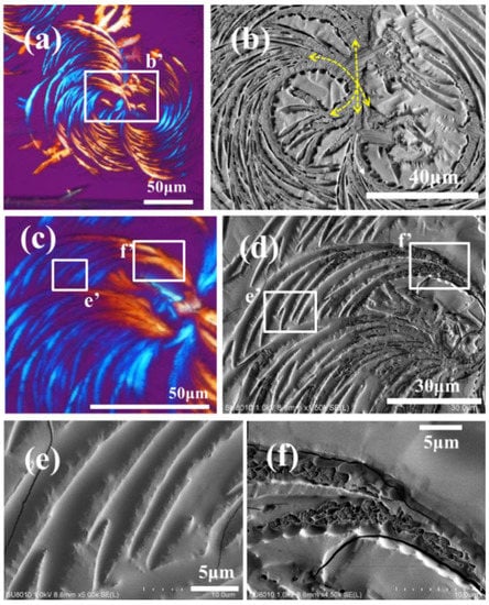 (a,c) POM and (b,d–f) SEM micrograph of (S)-MA/PVPh: (e,f) zoomed-in images of the squared regions—e′ and f′ in (c) (50/50) blend crystallized at Tc = 65 °C.