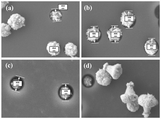 SEM images of pore-filling after 15 min CD (a), 20 min CD (b), and 25 min CD (c), and obtained nanostructures formed on the surface (d). The pore diameter varied from 400 to 500 nm.
