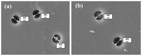 SEM images of the pores after ED with different voltages: (a) U = 1.5 V and (b) U = 1.75 V. Pore diameter ~300 nm.