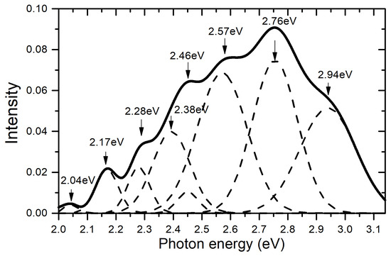The PL spectra of ZnSeO3/SiO2/Si present a wide band from 400 to 600 nm, as in the case of ED synthesized ZnSe2O5/SiO2/Si [40]. The luminescence of ZnSe2O3 can be expected, as for ZnSe2O5, as a combination of zinc oxide and zinc selenide luminescence. Similar to ZnO [66], the PL spectrum contains luminescence sub-bands of zinc vacancies (VZn, 2.94 eV) and oxygen vacancies (VO). The bands observed in the PL spectrum in the region 2.1 eV are similar to the PL band observed in ZnSe. This band is attributed by the authors of [67] to a complex center consisting of a zinc vacancy and an impurity small donor: VZn + D. As follows from Figure 5, the luminescence spectrum is quite complex and consists of several components. Similar, though not so complicated spectra are also observed in ZnO [47,66] and ZnSe [67,68]. A more accurate analysis of the excitation spectra of individual luminescence bands will make it possible to more accurately decipher their origin. However, this is beyond the scope of this work, but one subsequent article will be devoted to this. We only note here that the complex nature of the luminescence spectrum may also reflect the presence of a certain number of anti-site defects.