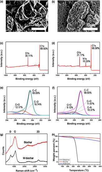 Functionalization of biochar: (a) SEM image of biochar and (b) m-biochar; (c) XPS survey of biochar and (d) m-biochar; (e) C1s spectra of biochar and (f) m-biochar; (g) Raman spectra of biochar and m-biochar; (h) TGA of melamine, biochar, and m-biochar.