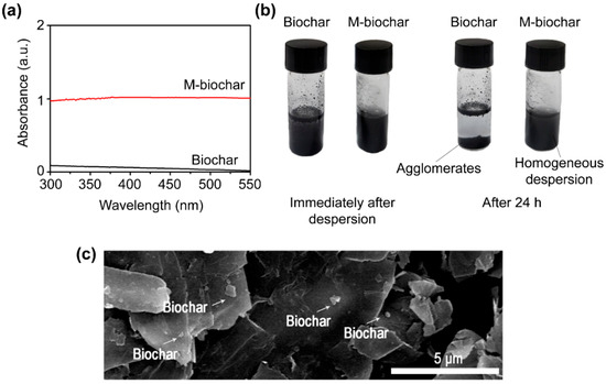 These functionalization processes facilitated the highly dispersive properties in the polar solvents, with the m-biochar exhibiting stable dispersive properties even after 24 h (Figure 3a). After 24 h, the 0.025 wt.% m-biochar dispersed in double distilled water (DDW) exhibited 100% of the absorption value at 550 nm, but 0.025 wt.% biochar dispersed in DDW only exhibited 10% of the absorption value at 550 nm. The dispersion stability is shown in Figure 3b. After 24 h of dispersion, the m-biochar did not exhibit agglomerated particles or precipitants. However, the prepared biochar exhibited numerous agglomerates, and precipitates were observed with clear separation of the dispersion and non-dispersion regions. Thus, the agglomeration of biochar caused by the π–π bonds hindered the homogeneous mixing and hydration of the concrete, and the casting process of the concrete was unavailable. However, the m-biochar did not agglomerate in polar solvents and was homogenously dispersed in the cement matrix (Figure 3c).