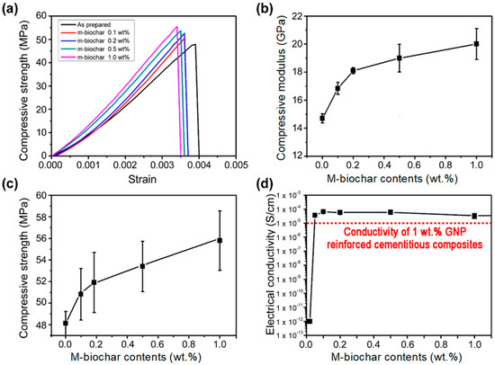 Mechanical and electrical characterization of m-biochar-reinforced cementitious composites with different weight loadings of m-biochar: (a) representative compressive stress–strain curves; (b) average compressive modulus; (c) average compressive strength; and (d) electrical conductivity (red line: 1 wt.% GNP reinforced cementitious composites).