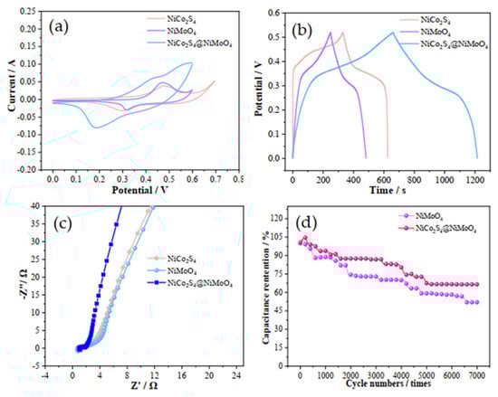 Figure 5a depicts the CV curves of NiCo2S4@NiMoO4, NiCo2S4 and NiMoO4 electrodes at 10 mV s−1. It is discovered that the envelope area of the CV curve of the NiCo2S4@NiMoO4 electrode is larger than that of NiCo2S4 and NiMoO4 samples, indicating that the NiCo2S4@NiMoO4 electrode has a large capacitance. The GCD curves of three electrode materials at 1 A g−1 are shown in Figure 5b, in which NiCo2S4@NiMoO4 electrode material has longer discharge time than NiCo2S4 and NiMoO4 samples, indicating its high specific capacitance. The dynamic characteristics of different electrodes in the frequency range of 100 kHz to 0.01 Hz with an amplitude of 0.01 V are analyzed by electrochemical impedance spectroscopy (EIS), as shown in Figure 5c. In the high-frequency region, the intercept of the real axis corresponds to the equivalent series resistance (Rs), and the radius of the semicircle corresponds to represents the transfer resistance (Rct). In the low-frequency region, the slope of the line is attributed to the Warburg resistance [29]. The lower Rs value of NiCo2S4@NiMoO4 electrode indicates that it has higher conductivity. The NiCo2S4@NiMoO4 electrode showed a more vertical line along the imaginary axis, indicating that the ion diffusion process was relatively fast. NiCo2S4@NiMoO4 electrode has excellent electrical conductivity. In order to study the cycle stability of three electrode materials, 10,000 cycles of charge–discharge experiments were carried out at 3 A g−1 current density, as shown in Figure 5d, indicating that NiCo2S4@NiMoO4 has good cycle stability with 69% capacitance retention.