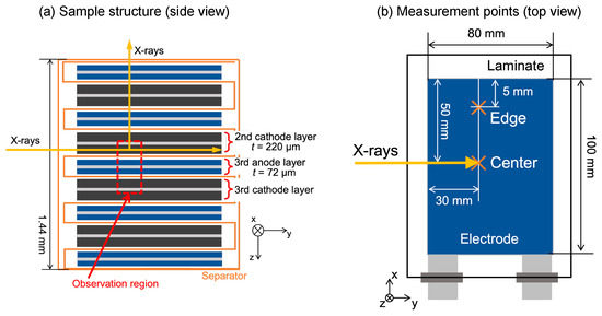 (a) Side view of stacked structure of laminated capacitor cell. Compton scattering X−ray energy spectra are measured within the dashed region using scanning incident X−rays; (b) top view of the electrode in the cell. Compton scattering measurements are performed on two positions marked by orange crosses.