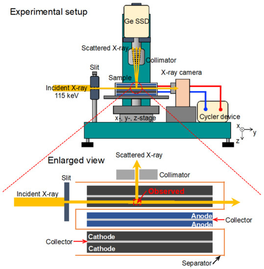 Compton scattering measurements were performed at high-energy inelastic scattering beamline 08W of SPring-8, Japan. The experimental configuration is shown in Figure 2. Incident X-rays emitted from the multipole wiggler were used. The energy of the incident X-rays was monochromatized to 115.56 keV, and the scattering angle was fixed to 90°. The Compton scattered X-ray energy spectrum from the sample cell was measured by nine-elements pure Ge solid-state detectors. The sample cell was placed on a 5-axis movable stage, which allowed the movement of the sample in the x-, y-, and z-directions, as well as with respect to the tilt angle, θ, and azimuthal angles. This flexibility allowed the measurements to be made in specific internal regions within the sample cell. The observation region in the sample cell was determined by the incident and collimator slits, as shown in the enlarged view in Figure 2. The dimensions of the incident and collimator slits were 10 μm in height, 1 mm in width, and 1 mm in diameter. In this study, we ignored the degradation of the sample by X-rays because the Compton scattering cross-section and the size of incident X-rays were very small. The state of charge of the sample cell was adjusted using a potentiostat/galvanostat. The Compton scattered X-ray energy spectra at charged and discharged states were measured after 1, 2, 3, 4, 10, 15, 20, and 25 cycles. One cycle was performed by first charging the cell using a constant current of 400 mA until the cell was fully charged, and then discharging it using a constant current of 400 mA until fully discharged. All measurements were performed at room temperature.