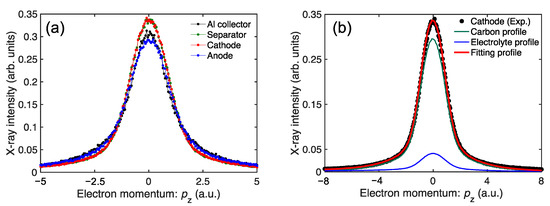where p = (px, py, pz) is the electron momentum, ρ(p) is the momentum density distribution, Ψj(r) is the wavefunction of an electron in the j-state, and nj is the electron occupation. From Equation (3), J(pz) is linked directly to the wavefunction of the electrons. With this connection, the redox orbital studies regarding lithium insertion and extraction in LIB materials were performed by combining the Compton scattering measurement and first-principles calculations [21,22,23,24,25,26]. The line shape of the Compton profile depends on the distribution of ρ(p), and its distribution is different for each atom. In our previous work, we found that the line shape of the Compton profile was sensitive to changes in right elements, such as Li [13]. Therefore, analyzing the line shapes of the Compton profiles allows us to quantify each element in the material. Analytically, the Compton profile was obtained by converting the x-axis of the Compton scattering X-ray energy spectrum from the X-ray energy to the electron momentum along z-direction, which can be achieved using the following conversion equation: