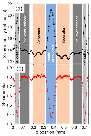 Figure 3a shows a Compton scattered X-ray energy spectrum for the corresponding regions inside the cell, including Al collector, activated carbon cathode, anode layers (including Li4Ti5O12 anode active material and Al collector), and separator, which was obtained by scanning the incident X-rays along the stacking direction of the cell. As the Compton scattered X-ray energy spectrum of the cathode and separator regions shows a narrow distribution as compared with that of the anode and collector regions, the line shape of this energy spectrum is representative of the different materials in the cell. Generally, the inside of a capacitor cell is filled with electrolyte. A fitting analysis was performed on the Compton scattered X-ray energy spectrum obtained from the cathode to evaluate the contribution of the electrolyte, as shown in Figure 3b. Energy spectra of the active material and electrolyte, which were obtained from the pellets of activated carbon and a solution of 1 mol of LiBF4 in PC, respectively, were used for the fitting analyses. From Figure 3b, the contributions of the active material and electrolyte to the Compton scattered X-ray energy spectrum of the cathode region are 86% and 14%, respectively. The non-destructively obtained Compton scattered X-ray intensity and S-parameter for the observation region marked in Figure 1a are shown in Figure 4a,b. The background shades in Figure 4 correspond to the different cell components, including the Al collector, cathode, separator, and anode. Notably, while the peaks corresponding to the Al collector, cathode, and separator are clearly visible, this study did not obtain enough spatial resolution to distinguish between the active material layer of the anode and Al collector, thereby, resulting in only a single peak for the anode region. Nonetheless, Figure 4 confirms that the Compton scattering technique can facilitate the internal-state analysis of a large-scale capacitor non-destructively.