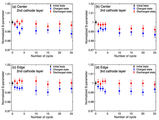 (a–d) Variation of the S−parameter with charge–discharge cycles obtained at the 2nd (left graphs) and 3rd (right graphs) layer cathodes for the center (top graphs) and edge (bottom graphs) positions. The initial state corresponds to a discharged state.