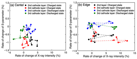 Compton scattered X-ray energy spectrum of the cathode was then measured at charged and discharged states after 1, 2, 3, 4, 10, 15, 20, and 25 cycles. Figure 5 shows the modification of the S-parameter at the center and edge positions at each charged and discharged state. The S-parameters are normalized by the S-parameter value of the initial (discharged) state, after averaging in S-parameters obtained from the cathode region which are highlighted by the dark gray background color in Figure 4. Evidently, the S-parameter values decrease as the capacitor cell is charged, and then increase to the value of the initial state as the capacitor cell is discharged. The S-parameter changes by about 1% with each charge and discharge, indicating that lithium moves between the cathode and the anode during each cycle, as expected. To investigate the structural changes inside the capacitor cell resulting from the cycling, we plotted and analyzed the correlation between the rate of change in the X-ray intensity and the rate of change in the S-parameter at the center and edge positions, as shown in Figure 6. The plot of the initial state corresponds to the origin in Figure 6. The correlation at the center position appears to be relatively concentrated, with the distribution in the Compton scattered X-ray intensity ranging from −5% to 5% and that in the S-parameter from −1.5% to 0%. Interestingly, the correlation at the edge position shows a different distribution as compared with that of the center position. Furthermore, the Compton scattered X-ray intensities show an especially large modification with the progress of the charge–discharge cycles. The change in the correlation between the Compton scattered X-ray intensities and the S-parameters with progressive cycling has also been shown in our lithium rechargeable battery studies, where the correlation has shown a clear difference by degrading the battery [28]. Therefore, the changes observed in the correlation shown in Figure 6b indicate the presence of capacitor cell degradation. Figure 7 shows the amount of movement in the cathode Al collector position until four cycles. The amount of movement of the cathode Al collector position from 10 cycles to 25 cycles could not be measured because we did not have enough time. Although the Al collector position shifts with the cycles in both the center and edge positions, the amount of movement in the center position is relatively small as compared with the large movement detected in the edge position. Since the Compton scattered X-ray intensity reflects the electron density at the probing volume, as shown in Equation (1), and because the capacitor cell is filled with an electrolyte, the change in the Compton scattered X-ray intensities at the edge position implies that the drift observed is due to the movement of the electrolyte. Therefore, the drift of the electrolyte material caused by the repeated use of the capacitor cell is likely to influence the ion distribution in all subsequent charge–discharge cycles.