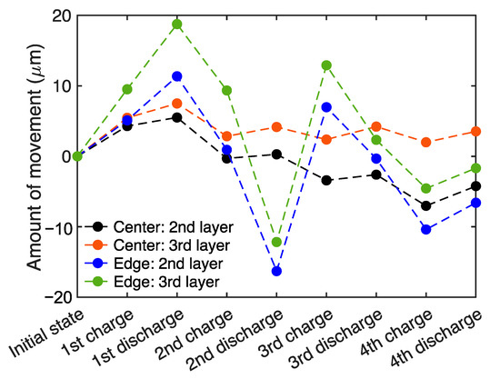 Amount of movement of cathode Al collector position corresponding to each cycle. The positive value of the y-axis corresponds to the z−direction shown in the coordinate in Figure 1a.