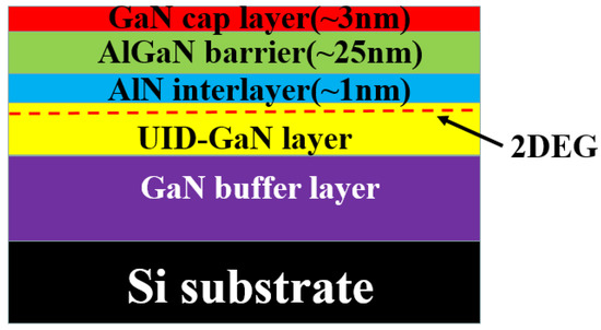 Traditional Si-based radio frequency (RF) and power devices, due to the physical limitation of Si material, cannot meet the requirements of higher-speed and higher-power in a 5G generation communication system. GaN-based HEMTs are regarded as promising candidates for high-frequency and high-power electronic devices due to their superior material properties [1,2,3,4]. The GaN-based materials are always heterogeneous and grown on other substrates, such as Si, SiC, and sapphire [5,6,7,8]. Among the heterojunction device structures, the AlGaN/GaN HEMT exhibits the best electronic characteristics [9,10,11]. Furthermore, the AlGaN/GaN-on-Si is the structure most commonly selected for power application for the following reasons [12,13,14,15]: the fabrication process is compatible with Si CMOS process flow, which helps to reduce the manufacturing cost. Realization of a large-size AlGaN/ GaN-on-Si wafer can also further reduce the cost. The regular epitaxial AlGaN/GaN layers are grown on a high-resistivity Si substrate by metal organic chemical vapor deposition (MOCVD), which is shown in Figure 1. From Si bottom to top, a GaN buffer layer with a thickness of about 3 μm is deposited for reducing stress caused by lattice mismatch. After that, the device layer is formed by depositing an unintentional doped (UID) GaN device layer (~100 nm), AlN interlayer (~1 nm), and AlxGa1-xN barrier layer (~25 nm, x varies from 0.15–0.4). The two-dimensional electron gas (2DEG) is formed at the AlGaN/GaN interface due to the polarization effect [16,17]. Finally, the GaN cap layer (~3 nm) is deposited for protecting the device surface.
