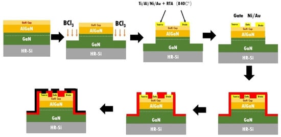 For RF application, the gate of the fabricated device is always formed in a T-shape for smaller gate resistance [18,19,20]. The process flow, which can be seen in Figure 2, consists of mesa isolation, source/drain ohmic contact formation, SiN passivation, T-shape gate formation, gate electrode deposition, via formation, and testing electrode deposition.