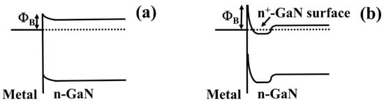 Energy band diagram of metal/(Al)GaN by reducing the barrier height(ΦB) (a) and increasing the possibility of tunneling by forming n+-(Al)GaN surface (b).