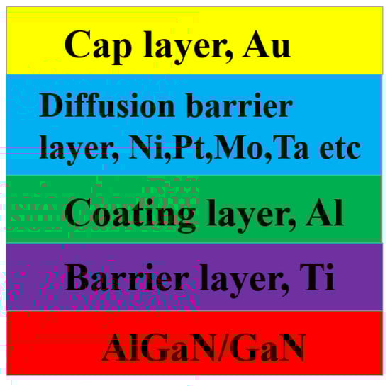 The results indicate that it is challenging to form good quality ohmic contact between single layer metal and (Al)GaN due to the higher Wm of the selected metal material. Also, the Ti, Al, etc. single layers are prone to oxidation during the high-temperature annealing process. Thus, a multilayer metal stack combined with a high-temperature annealing scheme became the common choice for GaN-based devices’ source/drain ohmic contact formation [47]. The multilayer metal stack, as shown in Figure 5, always consists of four metal layers: the barrier layer, coating layer, diffusion barrier layer, and cap layer. The most popular metal scheme is Ti/Al/X/Au, where X can be Ni, Mo, Pt, Ta, Ir, etc. During the annealing process, the barrier layer Ti reacts with the AlGaN layer to form TiN [48]. TiN carries out lower work function [49], which lowers the Schottky barrier height and therefore helps in ohmic contact formation. Also, the created N vacancies formed in the reaction process make the AlGaN layer underneath the contact metal n+-doped, which makes electron tunneling easy for ohmic contact formation [50]. Coating layer Al reacts with Ti under the high-temperature atmosphere to form Al3Ti, which helps in ohmic contact formation [51]. The diffusion layer Ni, Mo, Pt, and Ta etc., which owns high melt point prevents Au indiffusion and Al outdiffusion [52]. Furthermore, the surface morphology of the contact metal can be affected by the metal layer. Au, which acts as a cap layer, prevents the Ti, Al layer oxidation within the high-temperature annealing atmosphere. Also, the Au layer improves the contact conductivity [53].