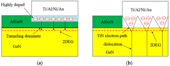 Universities and industries have conducted studies on the ohmic contact formation mechanism. Two methods are regarded as the mechanism to form ohmic contact to AlGaN/GaN HEMT: (1) a field emission (FE) tunneling mechanism [64,65,66] via the formation of a thinner high doping or a lower barrier; and (2) a spike mechanism [67,68] by TiN direct electron path formation along the dislocation. In the FE tunneling mechanism, Ti reacts with the GaN or AlGaN layer to form TiN. N should be extracted from GaN or AlGaN, generating a highly n-doped interface region, which is responsible for the occurrence of FE tunneling. The work function of TiN (3.74 eV) is lower than Ti (4.33 eV), which is believed to lower the Schottky barrier for low-resistance ohmic contact formation. In the spike mechanism, the TiN projections forming along the dislocation places penetrate through the AlGaN layer under a high temperature, which sets up a direct electron path connecting the 2DEG and the ohmic metal. This method is believed to be more efficient in electron transferring than the FE tunneling mode. With the improvement of AlGaN/GaN material growth, the spike phenomenon, which penetrates through the whole AlGaN layer, becomes less likely to happen. The cross-sectional diagrams of both physical models are shown in Figure 7, which reveals the ohmic contact formation mechanism.