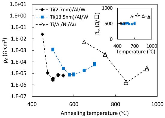 Specific contact resistivity ρC vs. annealing temperature. All samples were annealed for 1 min, expect for samples with Ti (2.7 nm)/Al/W, which were annealed for 10 min. The inset shows the corresponding channel sheet resistances Rsh. Reprinted with permission from Ref. [33]. Copyright 2018, Wiley.
