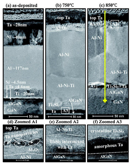Cross sectional high-resolution TEM images of (a) as-deposited, (b) 750 °C-annealed, (c) 850 °C-annealed non-gold ohmic contacts. (d,e): zoomed-in TEM images of Ta/Ni interface (A1) and metal/AlGaN interface (A2) of 850 °C-annealed non-gold contact in (c), respectively, and (f): zoomed-in TEM image of metal/AlGaN interface (A3) of 750 °C -annealed non-gold (Ta/Si/Ti/Al/Ni/Ta) ohmic contact in (b). Reprinted with permission from Ref. [82]. Copyright 2013, IOP science.