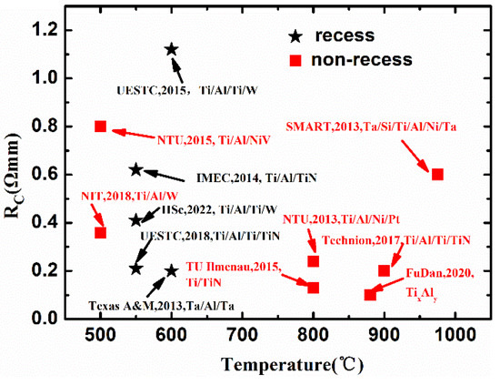 The benchmark of RC values against annealing temperatures of state-of-the-art Au-free ohmic contacts for the AlGaN/GaN HEMT can be seen in Figure 10, including recess and non-recess schemes [33,69,70,71,72,73,74,75,76,77,78,79,80,81,82]. It can be seen that low RC values (<0.3 Ω·mm) always occur with high annealing temperature (>600 °C) conditions. Only a few methods meet the low RC and low annealing temperature requirements. Thermal budget is another issue that should be considered in AlGaN/GaN HEMT source/drain ohmic contact formation.