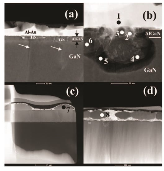 - Wang, L.; Mohammed, F.M.; Adesida, I. Dislocation-induced nonuniform interfacial reactions of Ti/Al/Mo/Au ohmic contacts on AlGaN/GaN heterostructure. Appl. Phys. Lett. 2005, 87, 141915. [Google Scholar] [CrossRef]