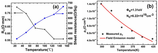 (a) Temperature−dependent characteristics of the RSH and RC of MWA−HEMT. (b) Measured (symbols) and modeled (lines) ρC of MWA−HEMT as a function of temperature. Reprinted with permission from Ref. [89]. Copyright 2017, IEEE.