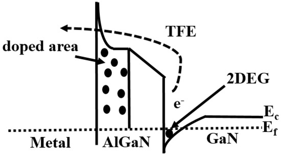 LA: Tzou A J et al. [92] demonstrated the incorporation of a Si implantation in the GaN HEMTs and non-alloyed ohmic contact process by using the LA method. The surface morphology, contact resistance, on-resistance, and surface trap density can be improved by LA instead of the RTA technique. Ferreyra R A et al. [93] achieved a non-alloy ohmic contact using a Hf/Al/Ti metal stack with the picosecond LA method, featuring the RC of 0.17 Ω·mm. Without source/drain n+ GaN regrowth, Sheng’s group proposed a laser annealing (LA) for AlGaN/GaN HEMT ohmic contact formation with a Ti/Al/Ni/Au metal stack [94]. The fabricated LA-HEMT exhibits smooth morphology, low contact resistance, high breakdown voltage and low dynamic on-resistance. The wafer is not damaged during the LA period due to the larger energy bandgap of GaN than LA photon energy. By applying a wavelength of 532 nm, 20 ns of a pulse duration, 100 kHz of pulse frequency, and energy density up to 2.99 J/cm2, the achieved RC is 2.18 Ω·mm [95]. The ohmic contact formation mechanism by LA has been studied and proposed. The experiment’s data fit the thermionic field emission (TFE) model closely. From their results they deduce that the current transport mechanism of the LA sample is dominated by thermionic field emission (TFE). The energy band diagram for the contacts annealed by LA can be seen in Figure 14.