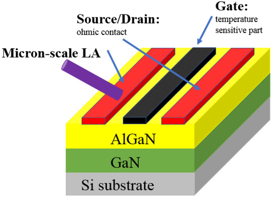 Instead of a whole device region under a high-power laser pulse, Liu et al. [98] proposed a micro-scale LA approach to form ohmic contact to AlGaN/GaN HEMT. The schematic illustration of the micron-scale laser annealing is shown in Figure 16. Due to the selective source/drain region heating by LA, the gate electrode, which is temperature sensitive, is not thermally affected. Therefore, gate-first devices is realized using this micro-scale LA technique. The extracted RC is as low as 0.3 Ω·mm when the laser power setting as 0.9 W. The high heating rate tends to form a thicker TiN layer, leaving a high density of N vacancy in AlGaN which makes tunneling much easier. In addition, the LA-HEMT shows better output current and smaller gate leakage.
