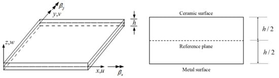 A metal-ceramic FG plate of thickness h in Figure 1 is considered. The bottom and top faces of plate are assumed to be fully metal and ceramic, respectively, and the gradient property varying along z-direction. Throughout the study, the Poisson’s ratio , Young’s modulus E, and density vary through the thickness as [18,40]
