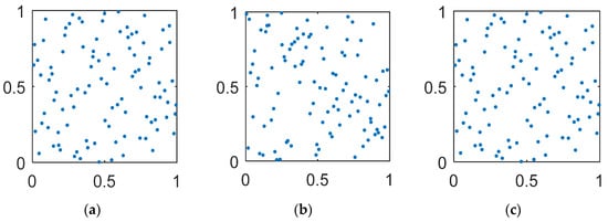 Example of 100 particles generated by different operators: (a) uniform pseudorandom generator, (b) Latin hypercube, and (c) Latin hypercube improved by maximizing the minimum distance between points.
